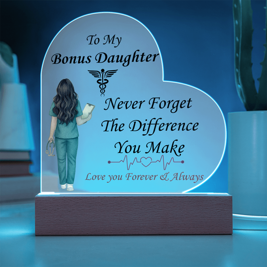 To My Bonus Daughter- "Never Forget, Nurse" - Acrylic Heart Plaque