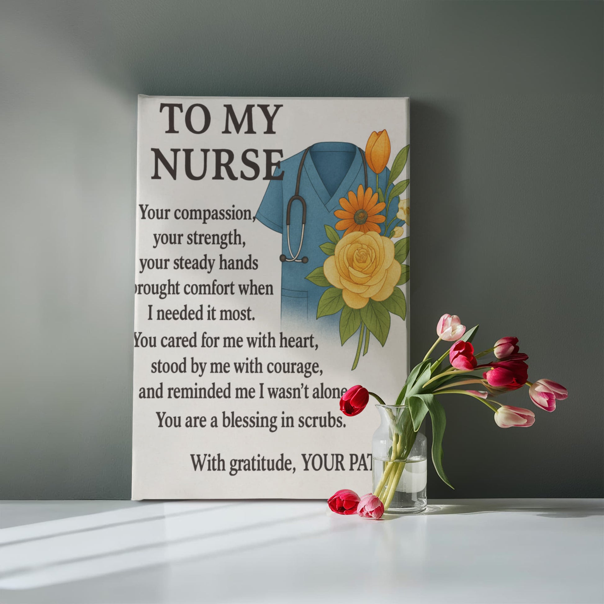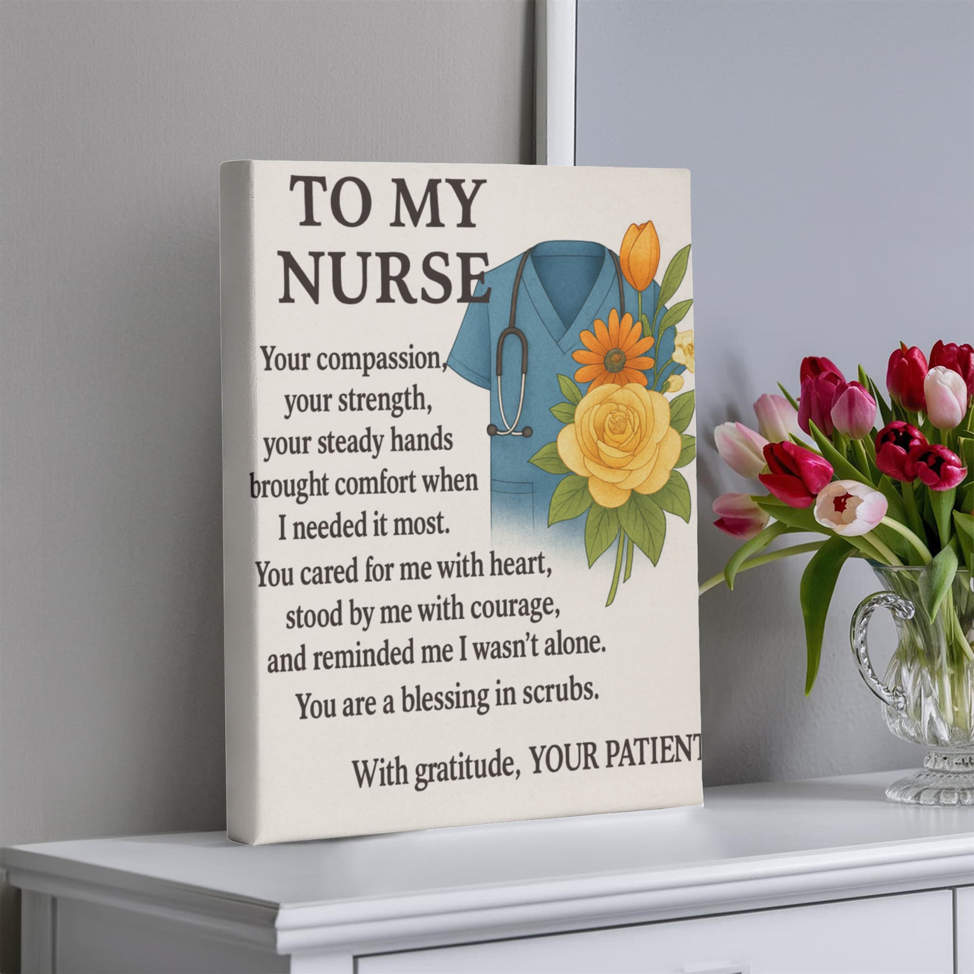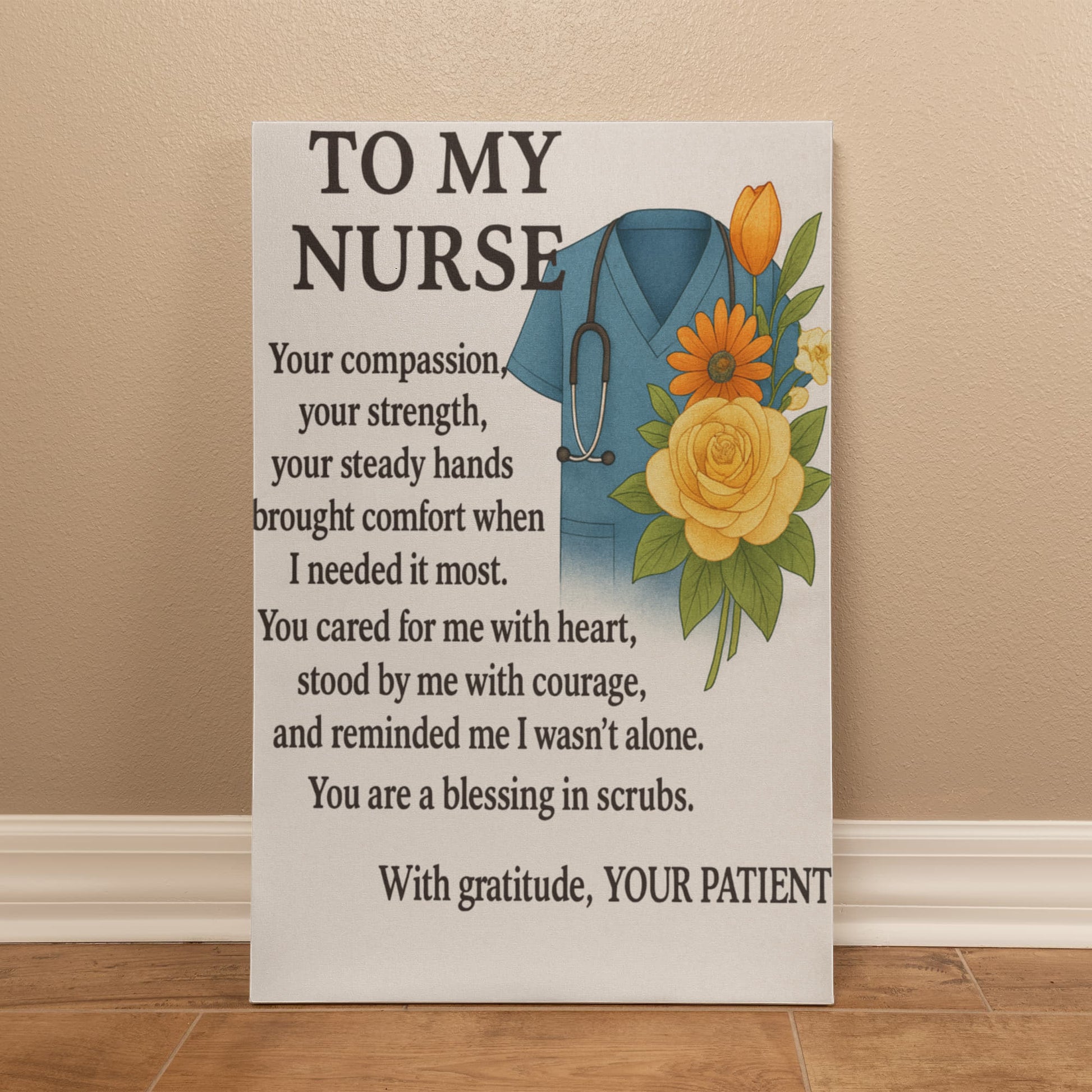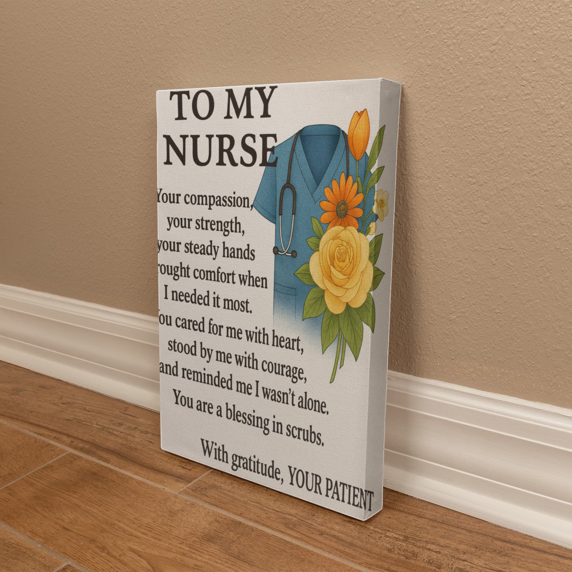 To My Nurse-Gallery Wrapped Canvas Celebrate the dedication and compassion of the healthcare professionals in your life with this striking gallery-wrapped canvas. Featuring a heartfelt design that honors nurses for their unwavering commitment to patient care, this piece combines emotional resonance with sophisticated décor appeal. The premium canvas wrapping ensures vibrant color reproduction and lasting durability, making it suitable for any room—whether displayed in a home office, bedroom, or clinical setting. This thoughtful gift acknowledges the sacrifices nurses make daily while adding meaningful artwork to their personal space. An ideal present for graduation, retirement, or simply to show appreciation for those who dedicate their careers to healing.