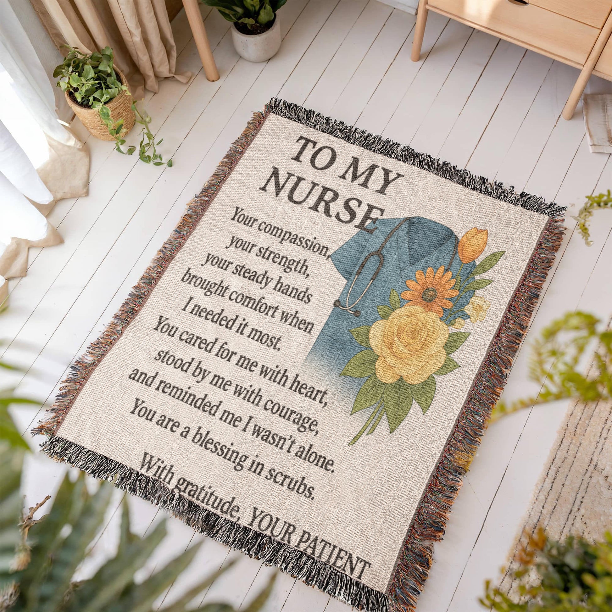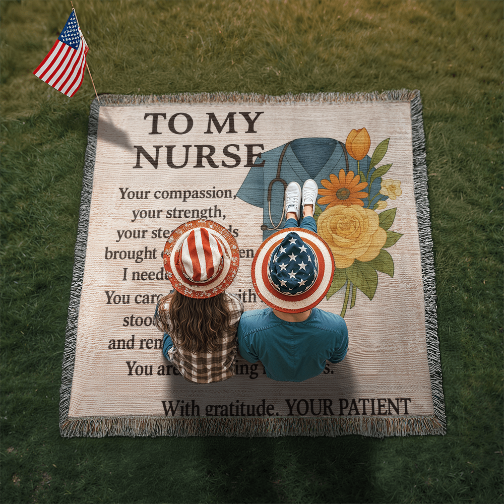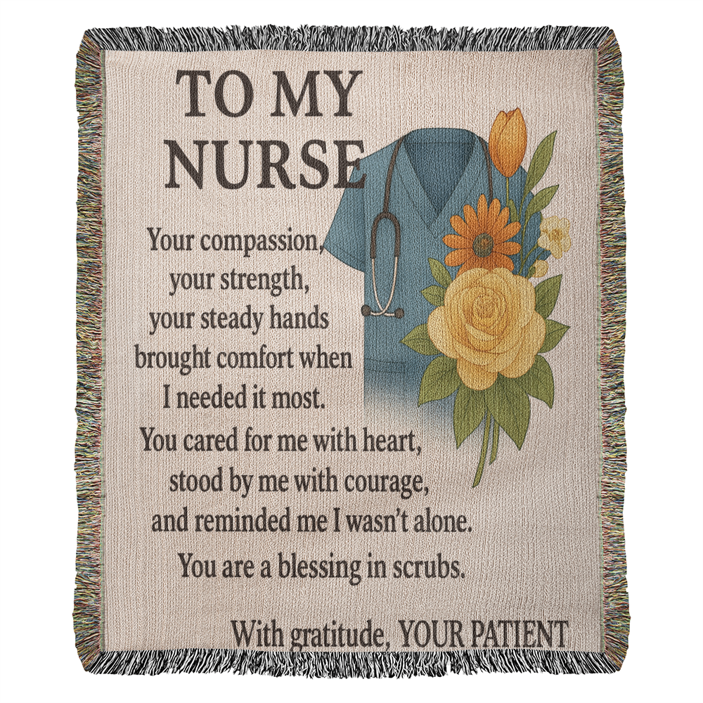 # TO My Nurse Heirloom Woven Blanket Transform a cherished into a timeless keepsake with this custom woven blanket, designed to honor the dedication and compassion of nursing professionals. Each blanket features your selected image intricately woven into premium fabric, creating a durable heirloom that celebrates the bond between caregiver and patient. Perfect for retirement celebrations, milestone achievements, or as a heartfelt thank-you gift that acknowledges years of service and sacrifice. This personalized blanket serves as both a functional comfort item and a meaningful tribute—ideal for draping across a chair, displaying on a bed, or gifting to a nurse who has made a lasting impact. A sophisticated way to preserve memories while expressing genuine appreciation.