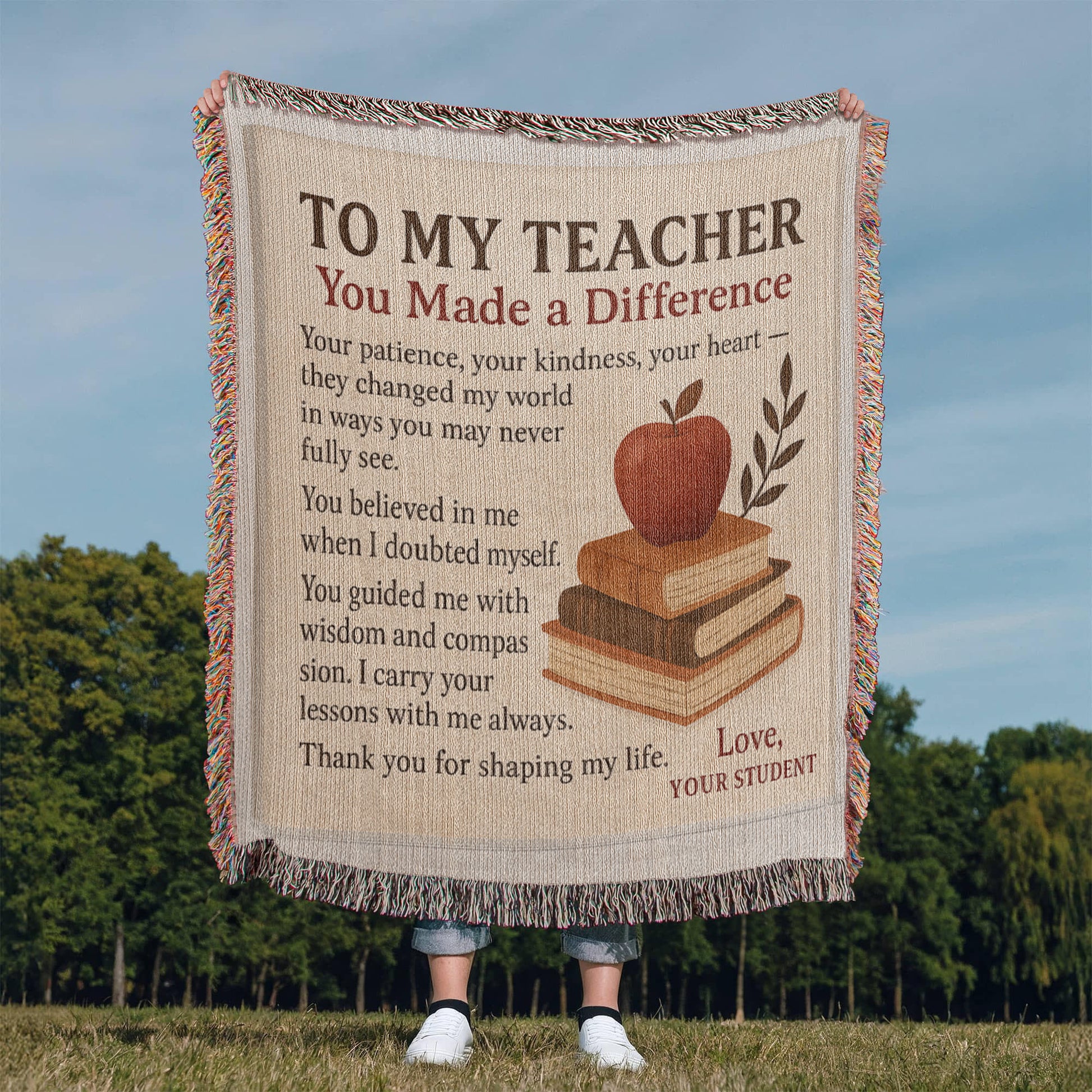 To My Teacher-Heirloom Photo Woven Blanket Celebrate the profound impact of a cherished educator with this personalized woven blanket. Perfect for end-of-year recognition, retirement milestones, or expressing gratitude during Teacher Appreciation Week, this heirloom-quality piece transforms a treasured photo into a lasting keepsake. The durable woven construction ensures this gift withstands years of use while preserving the memory of a meaningful mentorship. An ideal way to honor teachers who've shaped your journey.